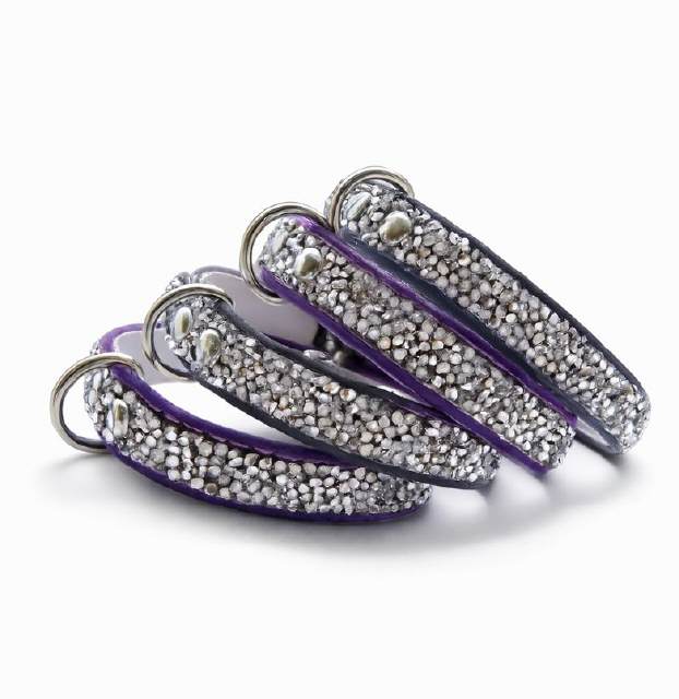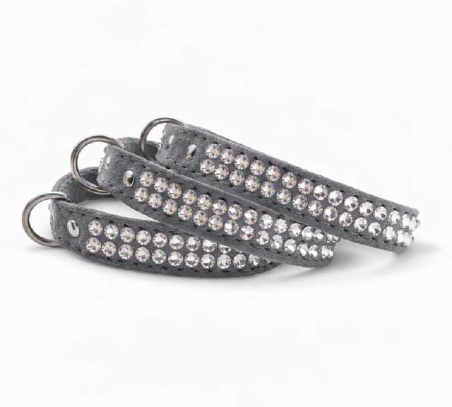Handgefertigte Welpenhalsbänder aus feinem Leder, liebevoll veredelt mit hochwertigen funkelnden Kristall-Elementen.